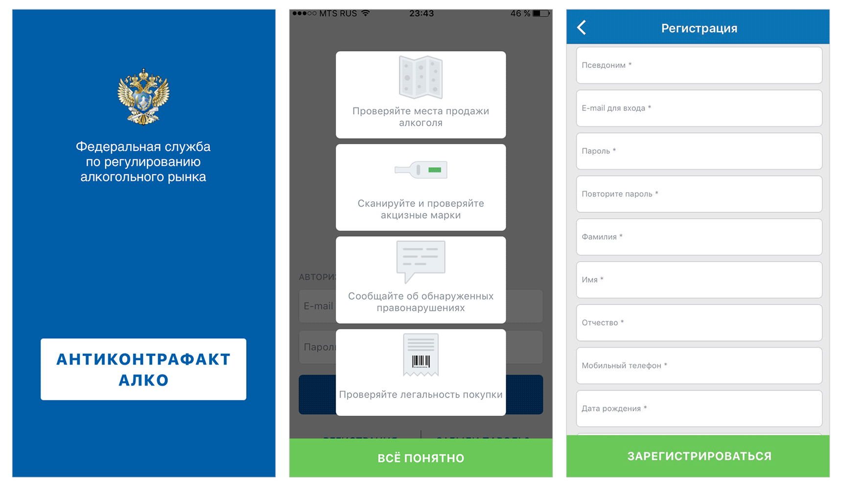 У додатку ФС РАР зібрано все, що потрібно для гульні: локації точок, де алкоголь продається, сканування акцизних марок, перевірка QR-кодів і можливість поскаржитися. Правда, для використання цих можливостей потрібно заздалегідь зареєструватися, вказавши не тільки пошту, але навіть дату народження і мобільний телефон