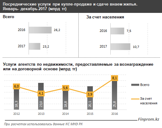 У січні-грудні 2017 року обсяги посередницьких послуг при здавання під найм та купівлі-продажу житла скоротилися на 11,4% (до 23,3 млрд тг), проти аналогічного періоду 2016 роки (26,2 млрд тг) *. У той же час, обсяг послуг, наданих за рахунок коштів населення зріс на 43% - з 7,5 до 10,7 млрд тг, що вказує на зростаючий попит на послуги ріелторів і в цілому на житло.