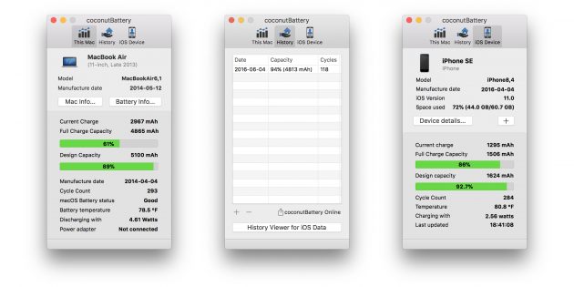 Якщо на iPhone або iPad коштує старіша версія ОС, ви можете подивитися вихідний і поточний рівні ємності акумулятора за допомогою Mac і згаданої вище утиліти сoconutBattery для macOS. Для цього потрібно встановити її на Mac, підключити iOS-пристрій через USB-кабель і клікнути по вкладці iOS Device у вікні програми.
