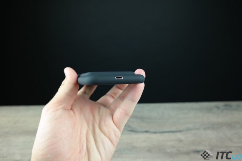 Динамік і мікрофон в нижній частині чохла також повністю закриті, але для них передбачені отвори, які передають звук в сторону лицьовій панелі. Роз'єму для навушників тут, звичайно ж, немає, на нижній частині знаходиться тільки порт Lightning. При цьому через нього чомусь не виходить послухати музику, як через порт в самому iPhone 7, що не дуже зручно.