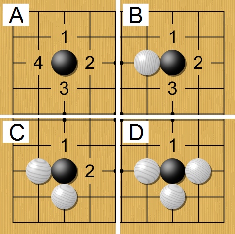 Приклад захоплення чорного каменю. Якщо на перетин (малюнок D, цифра 1) виставити білий камінь, то всі чотири даме чорного каменю будуть зайняті і він відправиться в «скарбничку» до супротивника. Фото з сайту: commons.wikimedia.org