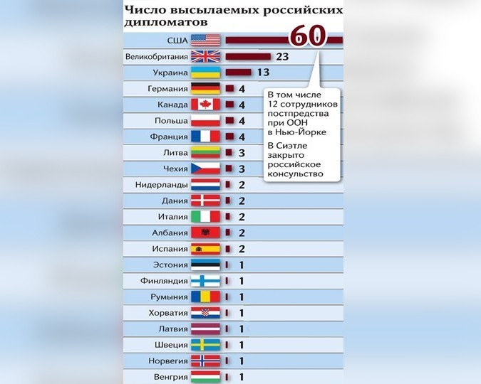 Найагресивніші кроки пішли саме з боку Вашингтона. З США будуть вислані 48 співробітників нашої дипмісії і ще 12 з місії ООН, буде закрито також генконсульство в Сіетлі. При цьому, що стосується приводу для таких дій, колишній аналітик сенату США з питань зовнішньої політики Джеймс Джатрас схиляється до думки, що Америка не зацікавлена в об'єктивному розслідуванні «справи Скрипаля», адже інакше всім стане зрозуміло, що Росія не має ніякого відношення до отруєння колишнього співробітника ГРУ і його дочки.