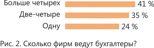 Дохід від ведення однієї компанії відносно невеликий. Тому багато бухгалтерів ведуть більше чотирьох компаній (рис. 2). Ми запитали у фахівців, скільки потрібно вести фірм, щоб знайти баланс між фінансовими результатами і затратами і в звітний період впоратися з усією роботою?