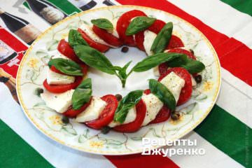 - Розкласти поверх томатів і моцарелли невеликі листя зеленого базиліка. Кількість листів - за смаком. Можна, якщо є час і бажання, перекласти томати і моцарелу окремими листям базиліка. Але це не принципово.