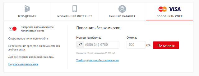 Другим варіантом поповнення з банківської карти є сайт " МТС Гроші ", Який в минулому році прийшов на зміну" Легкому платежу ". Перевагою його використання є те, що після авторизації можна додати дані карток, і поповнювати баланс без необхідності внесення їх кожен раз.
