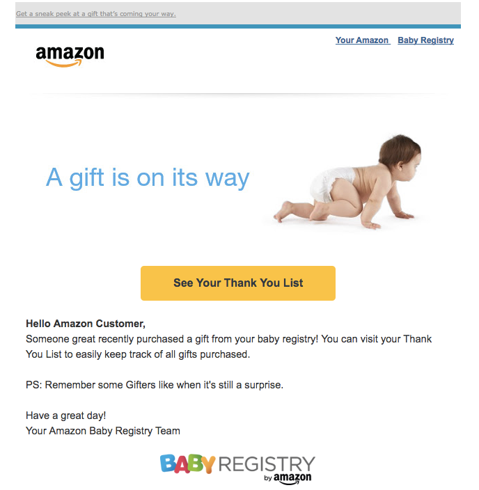 Багато клієнтів Amazon отримали цей електронний лист у вівторок. Бен Гілберт / Бізнес-інсайдери Деякі клієнти Amazon отримали сюрприз у вівторок, коли вони відкрили електронну пошту від компанії, яка розповіла, що хтось купив для них подарунок дитині. Ще більший сюрприз? Багато хто з них, мабуть, або не мали дитини або не мали реєстру подарунків дитини, перерахованих на сайті електронної комерції.