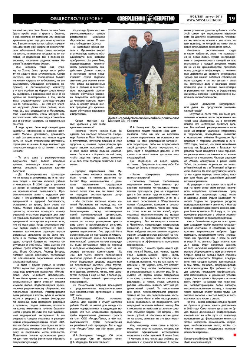 - Безумовно, після того, як була реалізована основна частина переселення жителів села Муслюмово, ми з колегами зрозуміли, що необхідно рухатися далі. Масштабний радіаційно-екологічний моніторинг уральських гідросистем і територій, проведений спільно з московськими вченими Володимиром Кузнєцовим та Мариною Хвостовий в 2010-2012 роках, показав, що такі населені пункти, як Бродокалмак і Татарська Караболка, також знаходяться в зоні серйозного радіаційного зараження і їх мешканці потребують відселення. Частинки радіації від «Маяка» виявлені в річках Ішим, Тобол, забруднені території не тільки в Челябінській, але і в Тюменській і Курганській областях. На мою депутатську зарплату ми видали наукову монографію, яка дає базис для подальших дій в цьому напрямку.