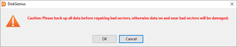 Крок 3 Ще одне попереджувальне повідомлення від DiskGenius, яке повідомляє ремонту пошкоджених секторів не рівнозначно відновлення файлів, і вам слід спочатку відновити дані. Натисніть "OK", якщо відновлення файлів не потрібно. Якщо ви хочете відновити дані, ви повинні натиснути кнопку "Скасувати" і скористатися функцією "Відновлення файлів" для сканування диска для пошуку втрачених даних.