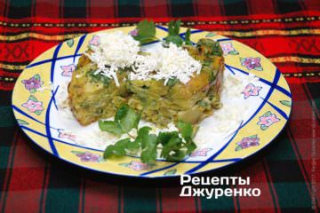 - Поки картопляна запіканка з яйцями і зеленню не охолола, ножем розрізати її на частини і перекласти на тарілки з допомогою лопатки.