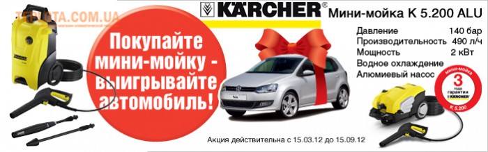 Умови Акції та дату розіграшу автомобіля Volkswagen Polo Ви можете знайти на офіційному сайті KARCHER - Україна. Період проведення акції: з 15.03.2012 по 15.09.2012 р Учасниками акції можуть стати всі покупці міні-мийки Керхер К 5.200 ALU на території України, які зареєстрували покупку під час проведення акції.