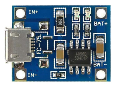 Перший модуль виконаний на базі відомого чіпа TP4056 і має схему захисту DW01 + ML8205A. Плата має невеликі габарити і забезпечує захист Li-ion і Li-Po акумулятора від перезарядження вище напруги 4.25 В, від переразряда нижче напруги 2.5 В, обмежує струм заряду до 1 А, струм розряду до 3.2 А і захищає від короткого замикання. На платі є контактні площадки B + і B- для підключення акумулятора, контактні площадки OUT + і OUT- для підключення навантаження, і microUSB вхід для підключення джерела живлення 5 В, а також майданчики + і - для підключення напруги живлення безпосередньо до плати.