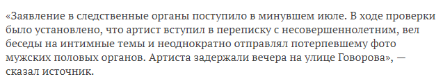 "Заява в слідчі органи надійшло в минулому липні. В ході перевірки було встановлено, що артист почав листуватися з неповнолітнім, вів бесіди на інтимні теми і неодноразово відправляв потерпілому фото чоловічих статевих органів. Артиста затримали вечора на вулиці Говорова", - висловився джерело вітчизняним журналістам.