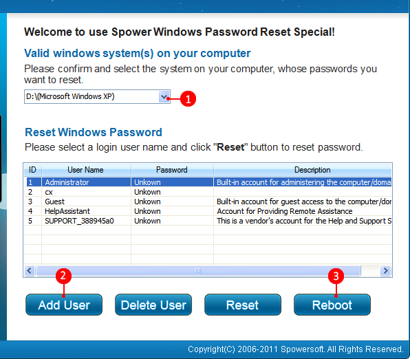 Програма досить швидка і легка навіть для новачків з базовими знаннями про Windows, щоб скинути пароль на всі версії систем Windows, включаючи XP / 7 / Vista / 8/10 і Server 2003/2008/2012. це дозволяє створювати обліковий запис з правами адміністратора.