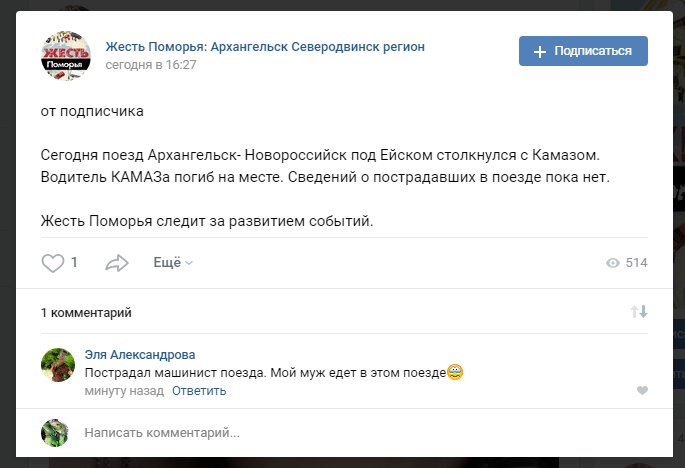 За словами очевидців страшної події в соціальних мережах, поїзд слідував з Архангельська до Новоросійська. ДТП сталося поблизу міста Єйськ. Причини зіткнення з'ясовуються. Імовірно чотири людини постраждали в результаті цієї аварії. З них двоє померли від отриманих травм.