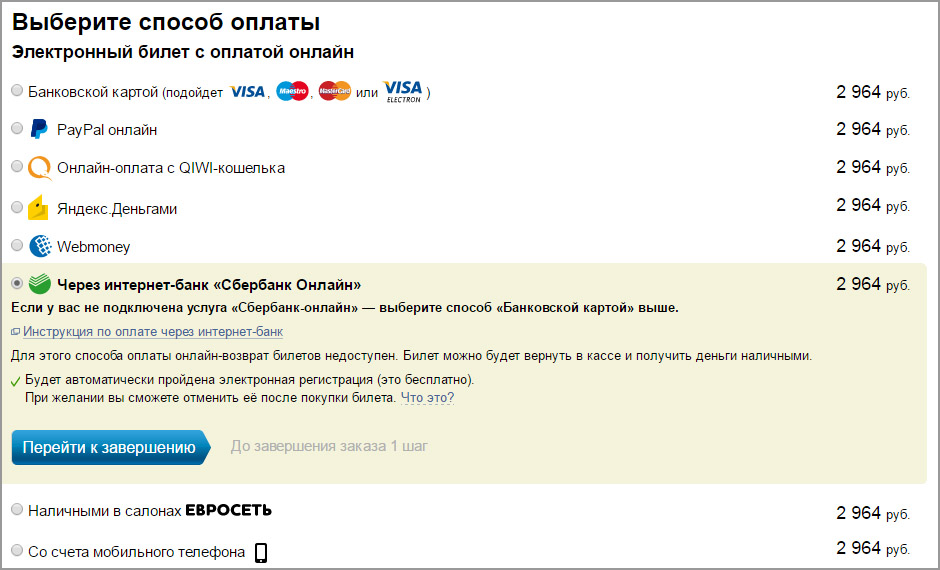 - Для обох способів оплати ( «Підтвердження по смс» і «Сбербанк Онлайн») онлайн-повернення квитків недоступний. Квиток можна повернути тільки в касі на вокзалі і гроші отримати готівкою. Якщо ви плануєте повернути квитки онлайн, рекомендуємо вибрати спосіб оплати «Банківської картою» (він перший в списку).