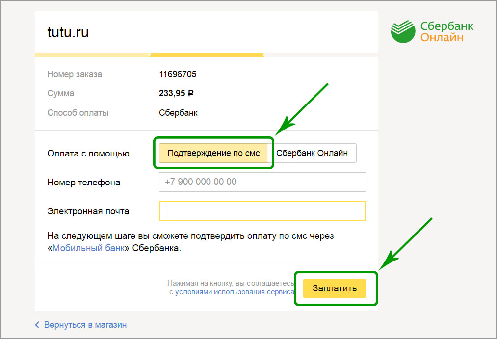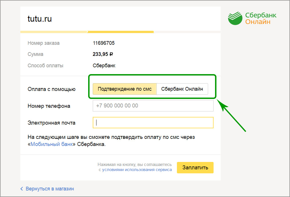Далі на кроці «Завершення замовлення» натисніть «Перейти до оплати». З'явиться вікно з вибором способу оплати: «Підтвердження по смс» або через "Сбербанк онлайн" .