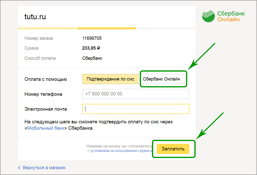 Оплата відбудеться через сайт «Сбербанк Онлайн». Введіть свій номер телефону та електронну пошту. Вони повинні збігатися з тими, які ви вказали раніше на кроці «Спосіб оплати». Потім натисніть на кнопку «Заплатити».