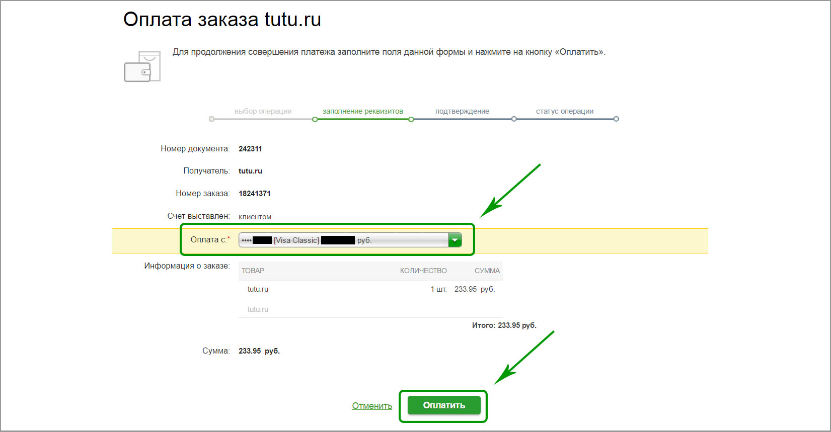 Ви зайдете в свій особистий кабінет на сайті «Сбербанк Онлайн», на сторінку заповнення реквізитів для замовлення квитка. Виберіть з якою карти ви хочете заплатити (якщо у вас їх декілька) і натисніть на кнопку «Оплатити».
