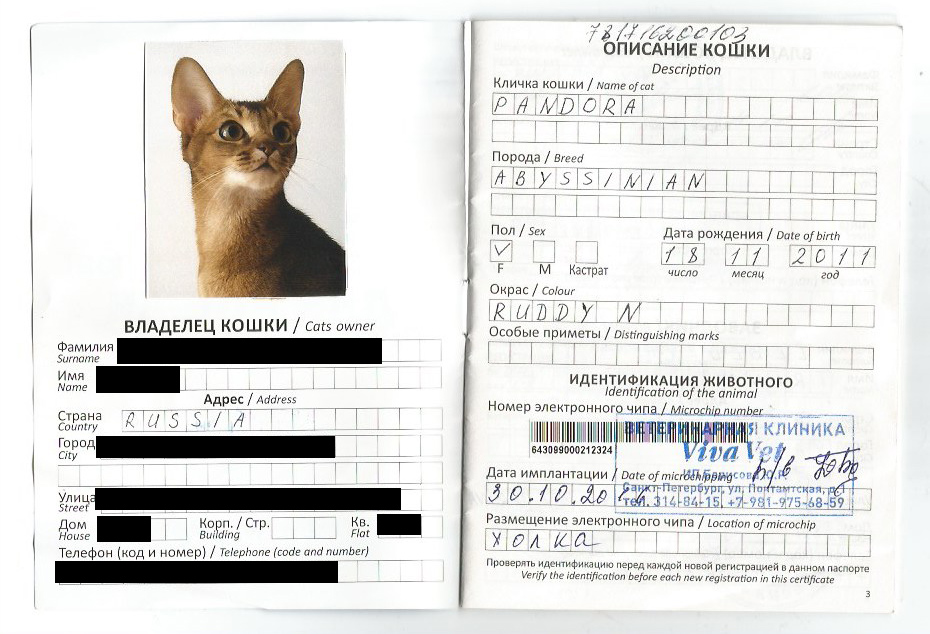 Ветеринарний паспорт. Купіть паспорт (від 150 Р) в будь-якому ветеринарному магазині. Сфотографуйте звіра анфас і вклейте фото в паспорт. Роздрукувати фото можна на будь-якому кольоровому принтері. Всі графи заповнюйте від руки англійською.