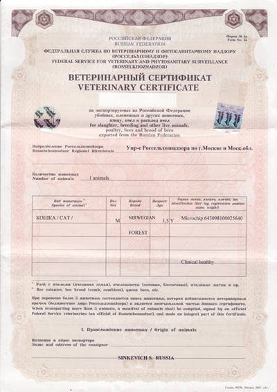 Приїжджайте в аеропорт за 3-5 годин до вильоту. У цілодобовому пункті прикордонного ветконтролю обміняйте ветеринарне свідоцтво № 1 на міжнародний сертифікат форми 5А. Він діє рівно добу. Перевірте всі дані в сертифікаті і проконтролюйте, щоб вам поставили печатку. Запишіться в ветконтроль заздалегідь, щоб до вашого приїзду потрібні папери вже були готові. Телефони пунктів ветконтролю в московських аеропортах вказані на сайті Россільгоспнагляду.