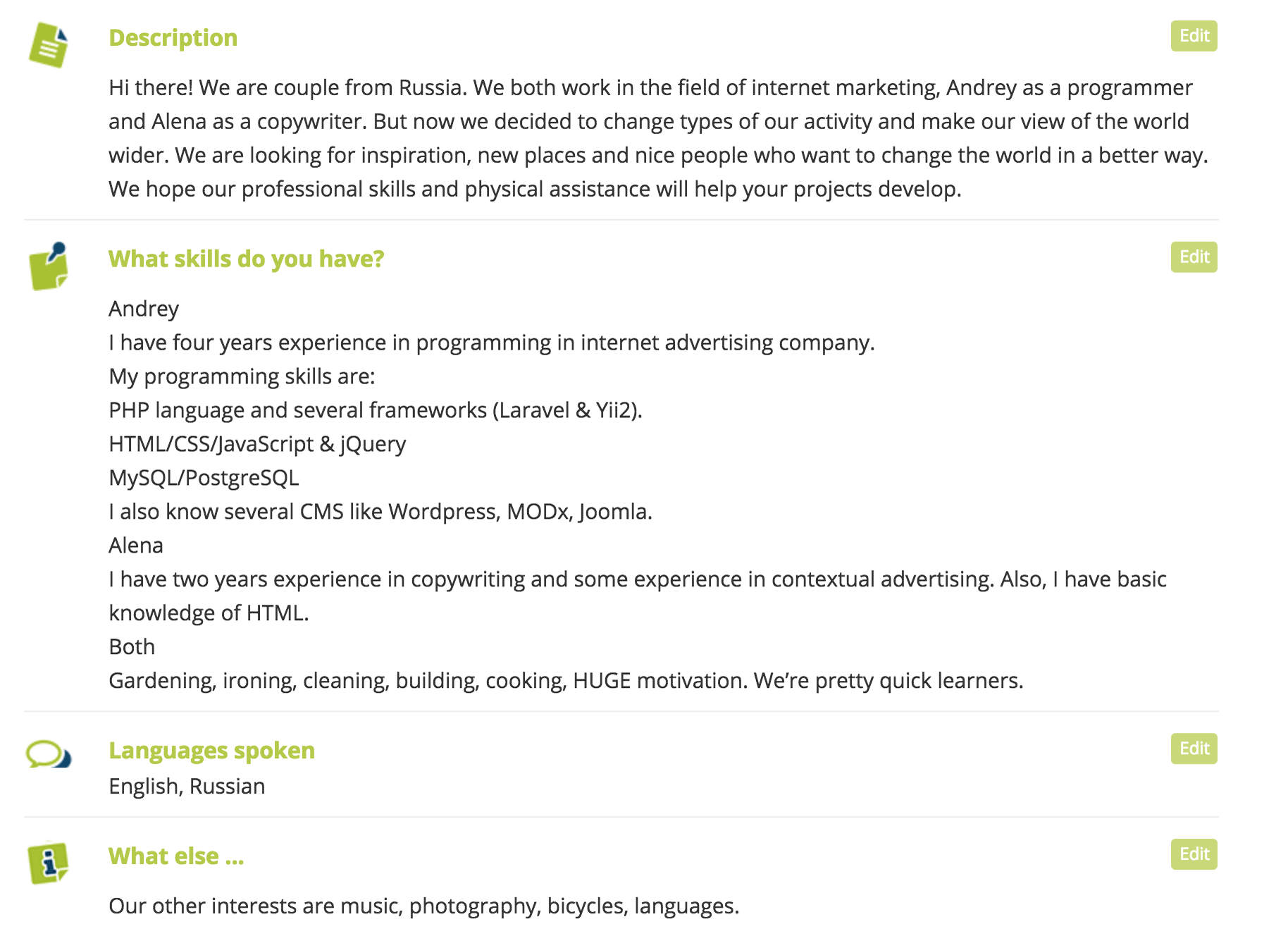 Інформацію в профілі заповнюйте докладно. Ваш аккаунт - це все, що приймаюча сторона про вас дізнається. Опишіть ваші вміння, розкажіть, чим ви можете бути корисні хосту.