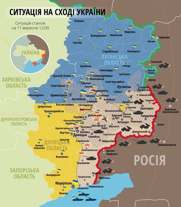 Згідно з оприлюдненою карті оперативної обстановки на 11 вересня, зокрема, під контроль бойовиків потрапили н.п. Комсомольське і Тельманове, а Україна перестала контролювати східну ділянку державного кордону.