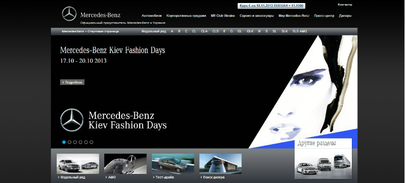 Стильне і загадкове поєднання чорного і сірого на ресурсі Mercedes-Benz аж ніяк не змушує бігти з сайту. Втім, справа тут не тільки в кольорі: унікальні колажі та ескізи можуть творити чудеса