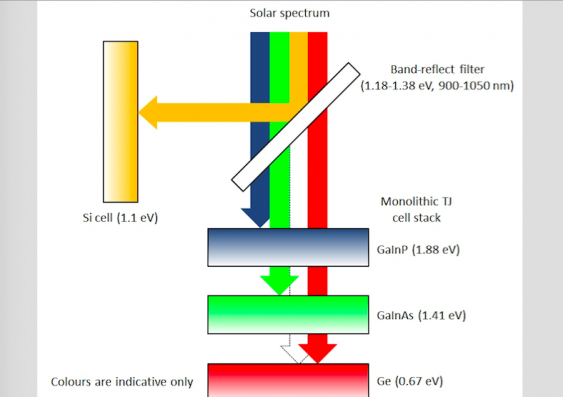 Інфрачервоний діапазон цього світла відбивається назад в сторону кремнієвої частини сонячної батареї, а інші три смуги спрямовані в три шари складаються з: індію-галію-фосфіду, індію-галію-арсеніду і германію.