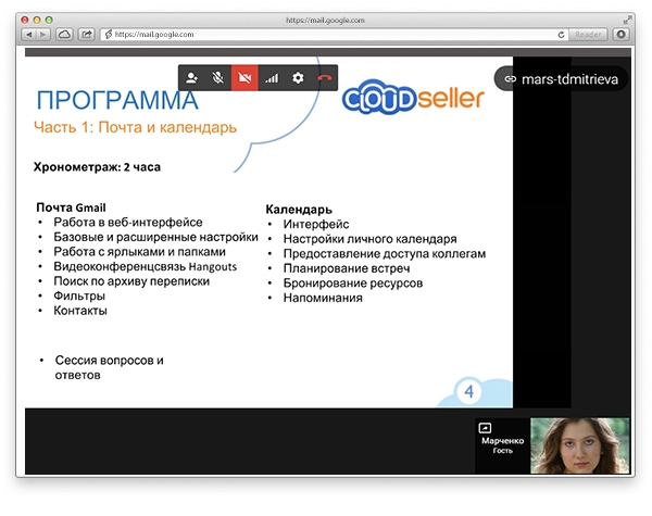 Фахівці Cloudseller живуть і працюють в Московському регіоні. Якщо ми не перебуваємо поруч, використовуємо для зв'язку чат Google Hangouts, який доступний прямо з пошти.