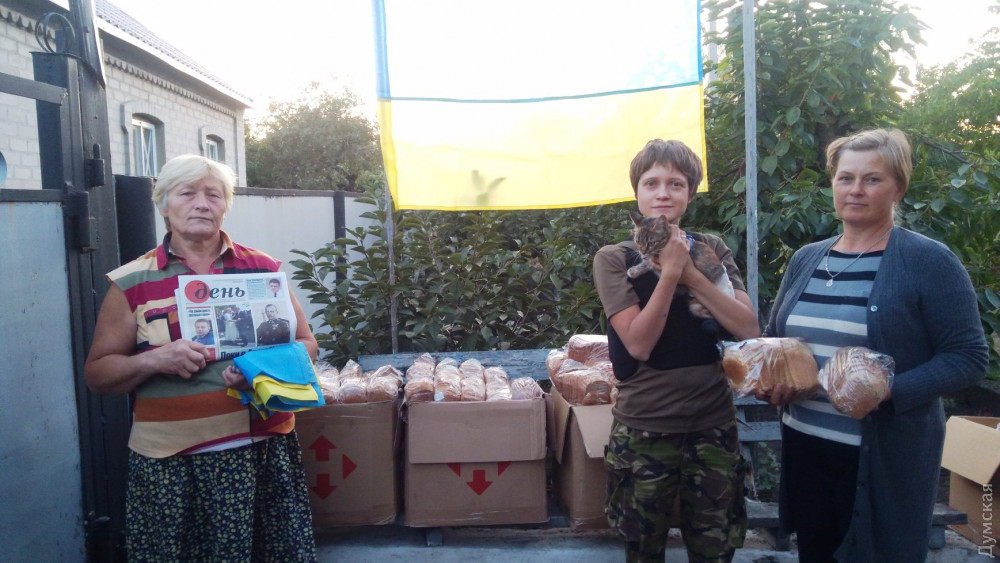«Вчора разом з кішечкою Вночі доставили хліб, газети та українські прапори в прифронтовій село Водяне. Жителі села не очікували отримати прапори в День Державного прапора України та були дуже раді такому подарунку! ».