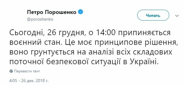 Президент України Петро Порошенко заявив , Що прийняв рішення про припинення дії воєнного стану персонально після аналізу складових поточної ситуації безпеки в Україні.