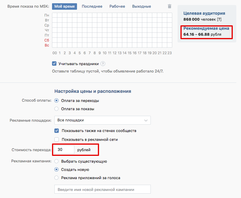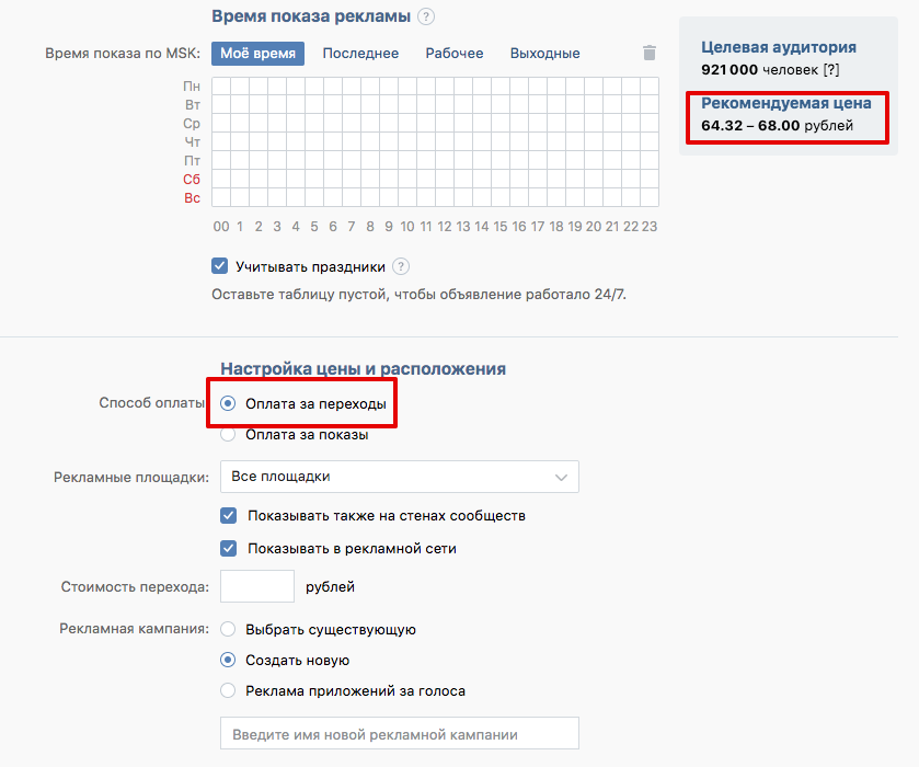 Вибрати спосіб оплати варто відразу, тому що при налаштуванні аудиторії збоку показується рекомендована ціна, і за замовчуванням це ціна за 1000 показів. Щоб було простіше оцінювати вартість, відразу перемикається на оплату за переходи.