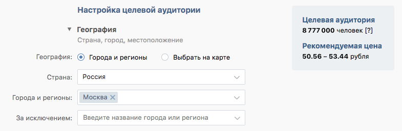 Вартість кліка (і показів) при рекламі на Москву і Санкт-Петербург найвищі. Якщо ви хочете просуватися на всю Росію, виключіть ці два міста (настройка «За винятком»), тоді вартість реклами буде нижче.