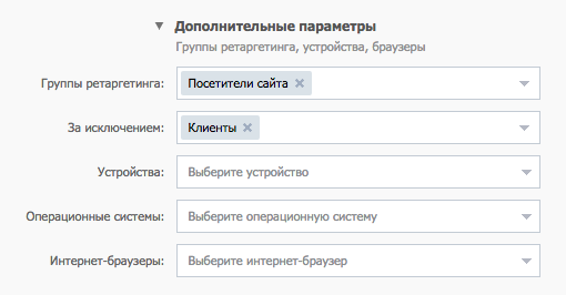 Будемо показувати оголошення відвідувачам сайту (зібраним за допомогою пікселя ВКонтакте) і виключимо клієнтів