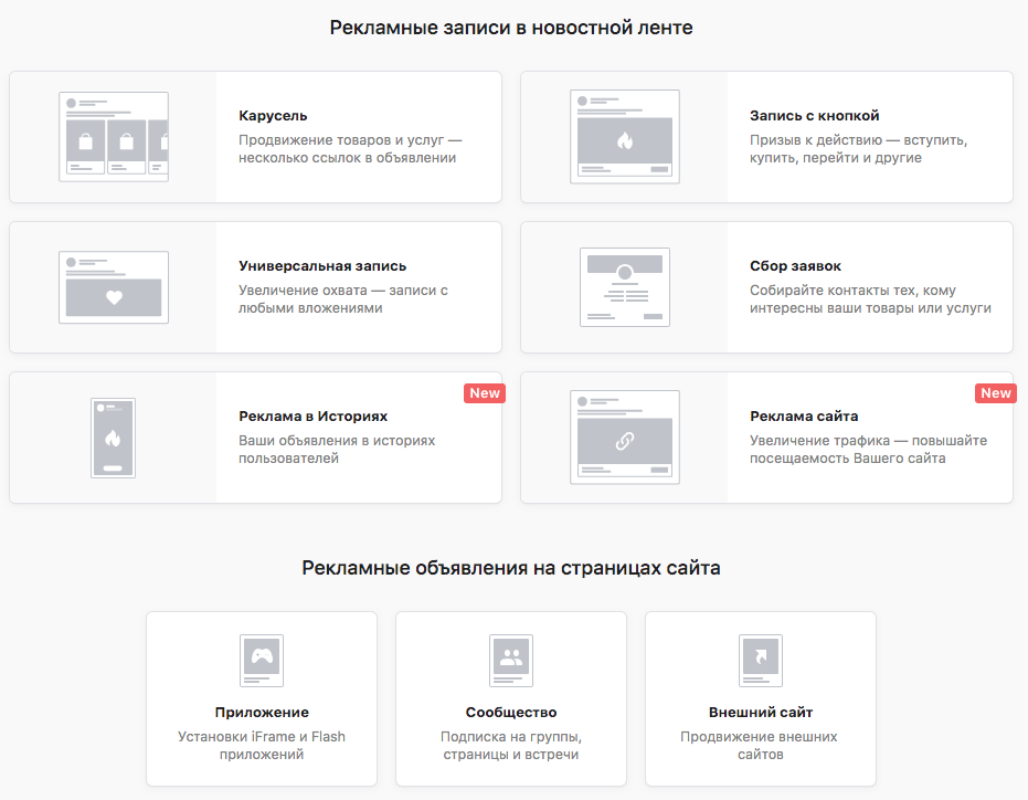 Натисніть на кнопку «Створити оголошення» в правому верхньому кутку рекламного кабінету, ви потрапите на сторінку з форматами реклами.