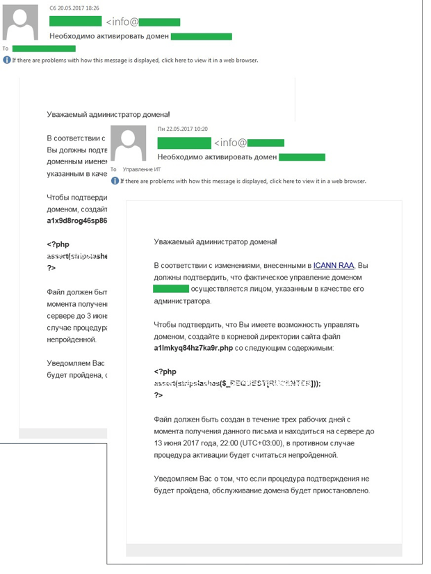 Для цього протягом обмеженого терміну в кореневій директорії сайту адміністратору пропонували створити PHP-файл певного змісту. Мовляв, якщо ці умови не дотримати, то реєстрація домену не буде підтверджена і його обслуговування буде призупинено.