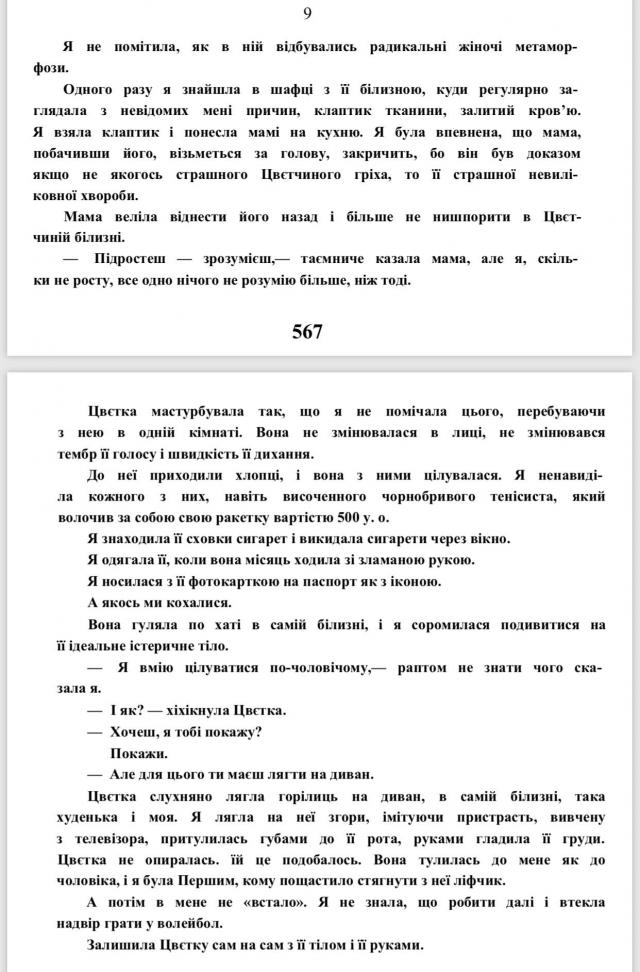 Здається, що тема лесбійських відносин вже цілком відкрита для громадського обговорення, але в тексті твори "Квітки і її я" дуже багато інтимних подробиць і сцен близькості.