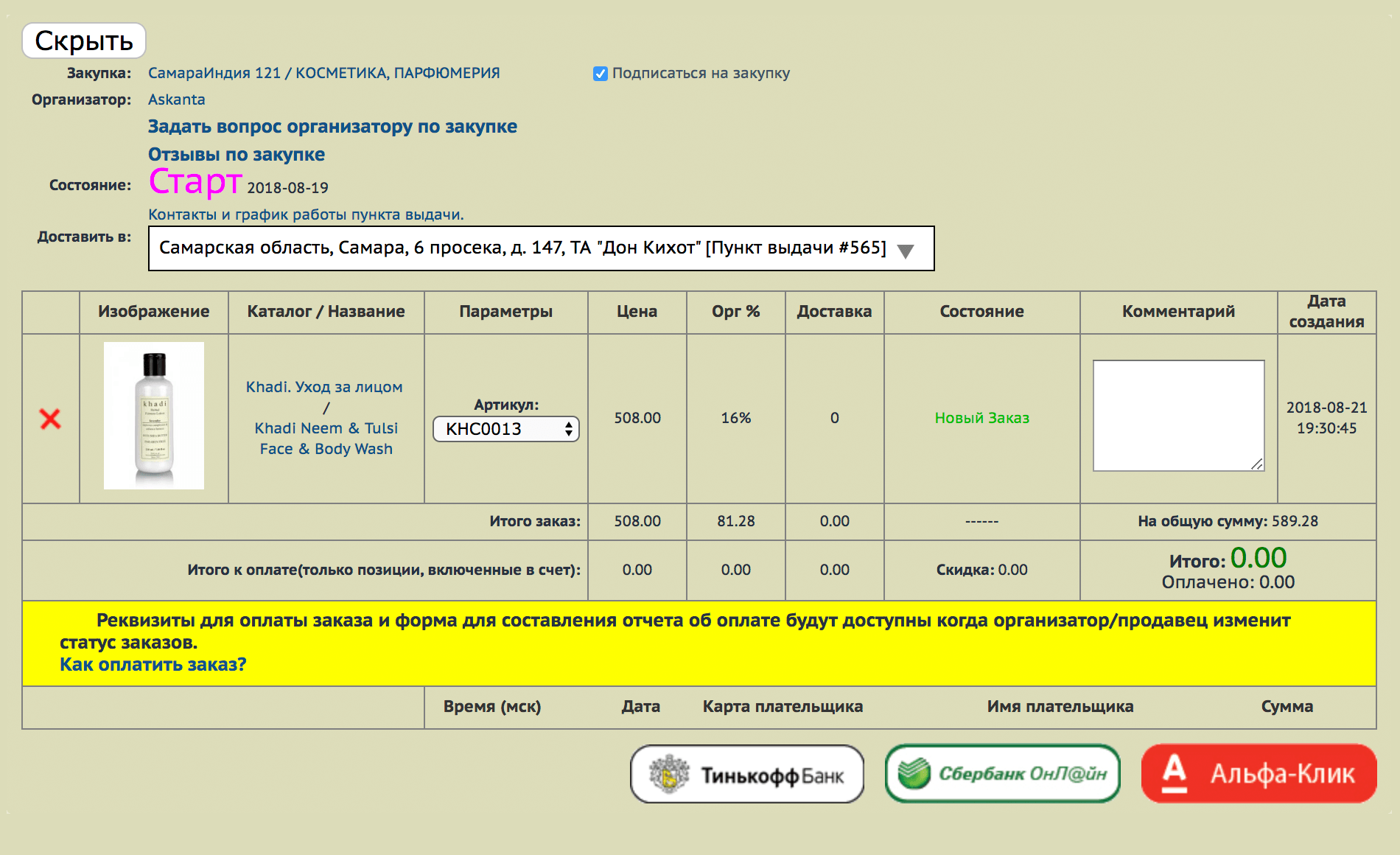 Нове замовлення з'являється в кошику. У міру збору закупівлі у нього змінюється статус. Позначка «Нове замовлення» означає, що організатор збирає закупівлю, а я можу відмовитися від товару в будь-який момент. На цьому етапі новачки оплачують 30-50% від вартості замовлення. Так відбувається в перші дві закупівлі. Потім статус новачка знімається, і ви платите всю суму, коли постачальник надсилає рахунок.