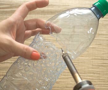 Нагрійте паяльник або цвях і, протикаючи бутель, створюйте ажур. Отвори розміщуйте в вигляді сітки, вони не повинні з'єднуватися. Видаліть непотрібну частину верху гарячим паяльником або цвяхом.
