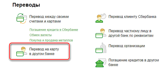 Переклад на карту в іншому банку відрізняється наявністю комісії і збільшеним терміном виконання перекладу. В іншому ж процес перекладу майже не відрізняється для кожного із способів. При перекладі через сайт або додаток «Сбербанк онлайн» потрібно зробити наступне: