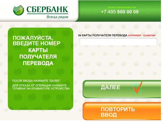 Натисніть на кнопку «Переказ коштів» в головному меню банкомата - Як спрямовуючу силу перекладу вкажіть «Клієнту ощадбанку» і введіть номер його карти.