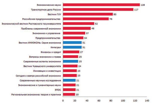 На основі даних авторефератів більше 1200 липових дисертацій з економіки, захищених починаючи з 2007 року, був складений рейтинг журналів, в яких найбільш часто публікувалися здобувачі (див. Рис. 1).