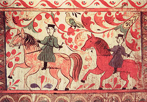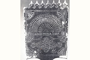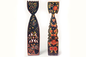 поч. XX століття. майстер Кирило. Дерево, різьблення, забарвлення, розпис. 101х59, д. Григорова, Кирилівський с / с, Кічменгскій-Городецький р-н // Горбатова Т. В. Розписи Вологодської землі: методичний посібник: Кічменгскій-Городецька розпис. - Вологда, 2011. - C. 7.