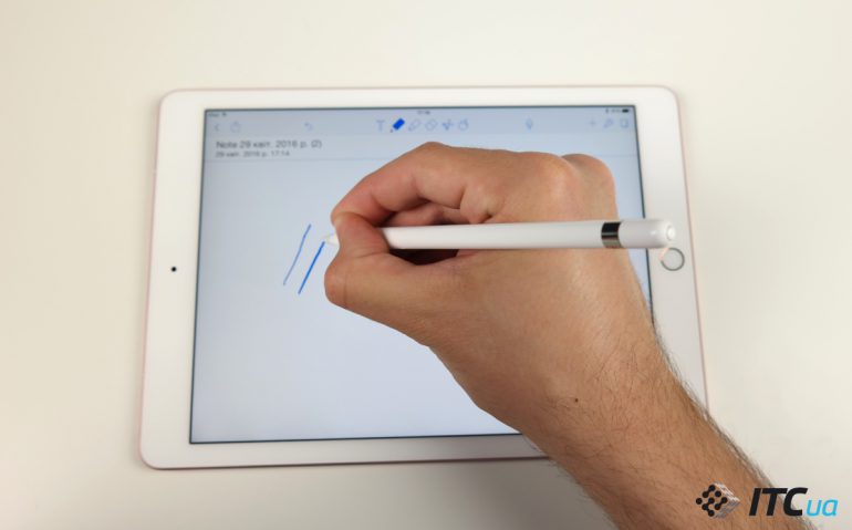 Основним же достоїнством Apple Pencil є точність роботи, лаг між стилусом і екраном дуже маленький, іноді і зовсім здається, що пишеш не по дисплею, а як ніби на папері. При цьому можна спокійно покласти руку на екран, він автоматично розпізнає це і не спрацьовує.