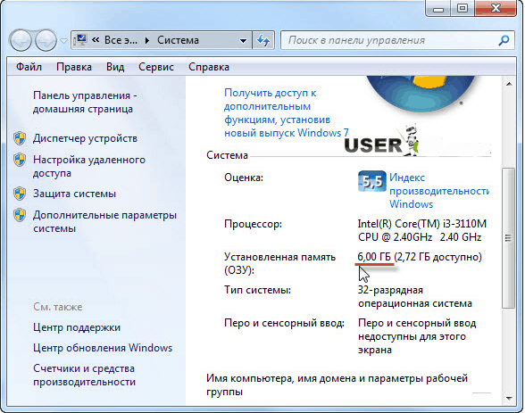 В результаті з'явиться вікно, де буде вказано розмір доступної оперативної пам'яті, тип операційної системи (наприклад, 32-бітна) і т.д.