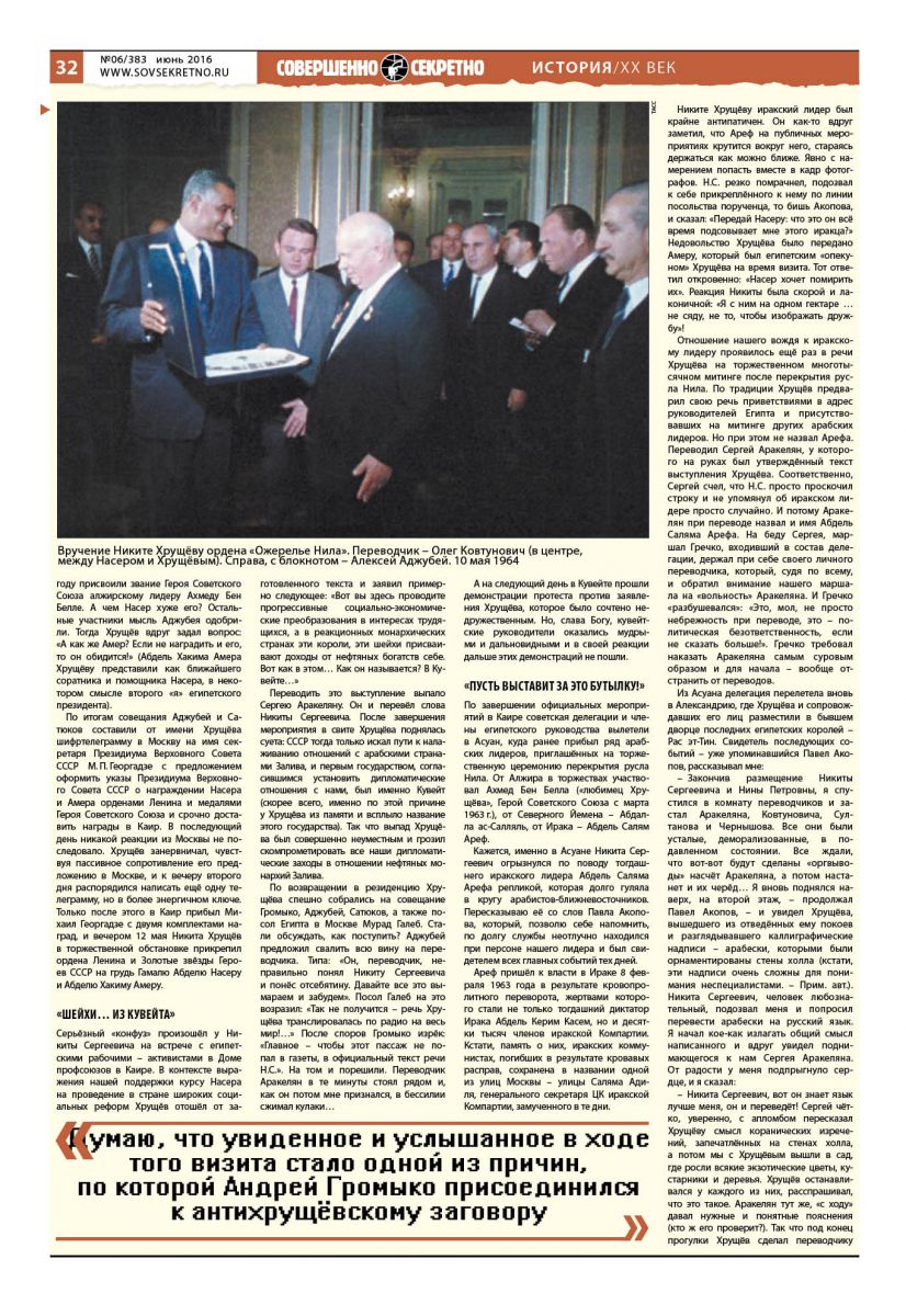 - Закінчивши розміщення Микити Сергійовича і Ніни Петрівни, я спустився до кімнати перекладачів і застав Аракелян, Ковтуновича, Султанова і Чернишова. Всі вони були втомлені, деморалізовані, в пригніченому стані. Всі чекали, що ось-ось будуть зроблені «оргвисновки» щодо Аракелян, а потім настане і їх черга ... Я знову піднявся наверх, на другий поверх, - продовжував Павло Акопов, - і побачив Хрущова, який вийшов з відведених йому покоїв і роздивляється каліграфічні написи - арабески, якими були орнаментовані стіни холу (до речі, ці написи дуже складні для розуміння неспеціалістами. - Прим. авт.). Микита Сергійович, людина допитлива, покликав мене і попросив перевести арабески на російську мову. Я почав абияк викладати загальний зміст написаного і раптом побачив, що піднімається до нас Сергія Аракелян. Від радості у мене підстрибнуло серце, і я сказав: