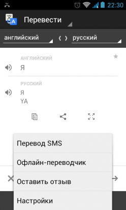 Нова версія мобільного перекладача дозволяє завантажити словники потрібних вам мов і користуватися ними для перекладу в офлайні. Англійська словник встановлений в системі за замовчуванням, так що вам буде потрібно вибрати і завантажити на свій телефон будь-який з інших доступних в програмі мов. Для цього натисніть кнопку меню і виберіть пункт Офлайн-перекладач.