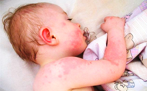 - Герпес 6 типу. Вірус герпесу 6 типу у дітей викликає розеолу, або раптову екзантему. Це захворювання також називають псевдокраснухой. Характерний симптом - рожеві дрібні папули на шкірі, які при натисканні бліднуть. На початку захворювання піднімається температура, але немає ні кашлю, ні нежиті. Дитина швидко одужує. Герпес 6 типу у дітей нерідко вводить лікарів в оману: начебто було гостре початок, підвищення температури, але ніяких катаральних ознак не було. Спочатку ставиться діагноз ГРВІ або ГРЗ, і тільки після появи висипу виникають підозри: краснуха це або розеола? Часто висип при раптової екзантеми плутають з алергічними висипаннями.