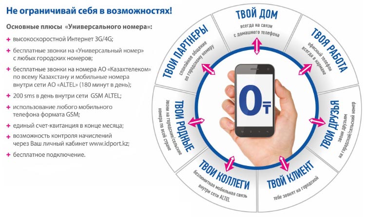 «Універсальний номер» надає досить широкі можливості для спілкування: абонентам всіх тарифів (всього їх три: Базовий - 1990 тг / міс, Стандарт - 2490 тг / міс і Преміум - 3990 тг / міс) доступні безкоштовна вхідний зв'язок з міських номерів, 180 хвилин вихідних дзвінків в день на всі міські номери АТ «Казахтелеком» і на номери Алтел (в разі перевищення цього ліміту, вартість однієї хвилини складе 3 тг). Крім того, в абонплату входить пакет високошвидкісного інтернету (на Базовому тариф - 1 Гб, на Стандарті - 5 Гб, а Преміум дає безлімітний трафік) та 200 безкоштовних SMS в день всередині мережі Алтел. Інша перевага - в межах абонентської плати користувачам «Універсального номера» надається можливість дзвонити абонентам інших операторів по тарифу всього 3 тенге за хвилину. Залежно від підключеного тарифного плану надається 60, 100 і 200 хвилин на місяць за пільговим тарифом, а в разі перевищення ліміту вартість хвилини буде вважатися по 11 тг.