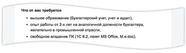 Тільки після опису всіх вигод і умов роботи можна приступати до вимог. Але не навпаки! Вказуйте тільки ключові вимоги, без яких робота на даній позиції неможлива.